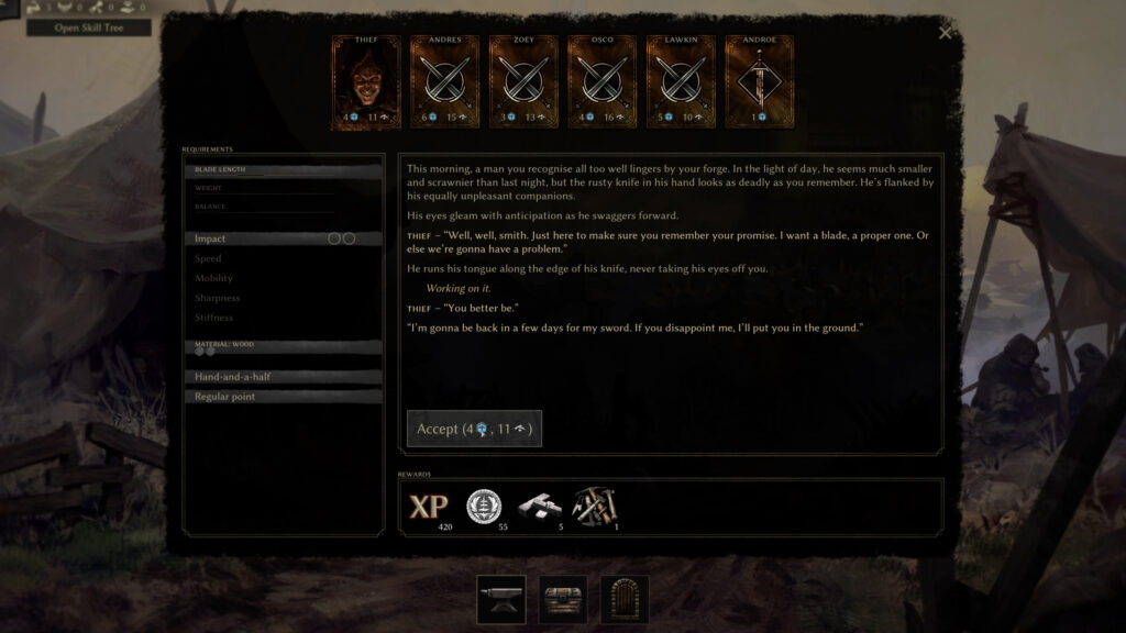 At first, the pacing can feel slow. The early in-game days are spent learning systems, meeting NPCs, and fulfilling simpler commissions. It took me roughly two in-game days for the narrative rhythm to settle and the experience to flow naturally. Once it does, the game becomes surprisingly absorbing. Dialogue choices, commission outcomes, and faction relationships flow pretty easily and make the experience immersive, making your role as a swordsmith feel quietly powerful.